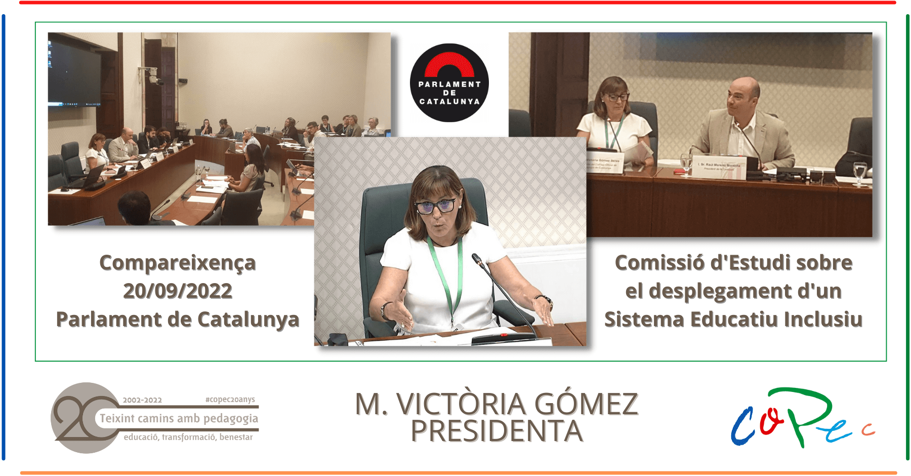 - El Col·legi Oficial de Pedagogia ha fet una Compareixença al Parlament de Catalunya davant la Comissió d’Estudi sobre el Desplegament d’un Sistema Educatiu Inclusiu, representat per la seva presidenta M. Victòria Gómez.