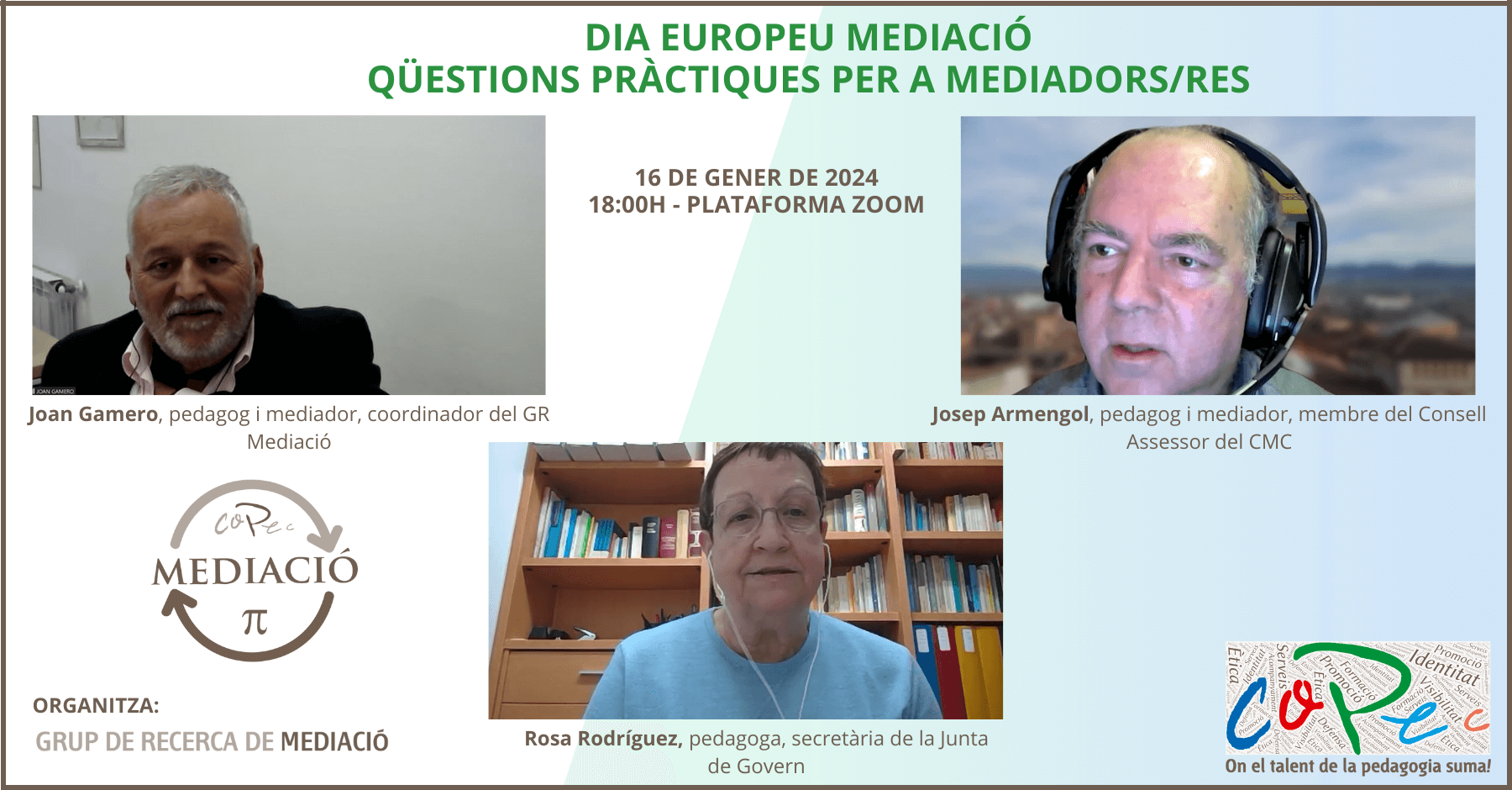 Ahir, 16 de gener de 2024, va tenir lloc el webinar "Qüestions Pràctiques pels Mediadors/es", organitzat pel Grup de Recerca de Mediació del COPEC, una sessió virtual a través de Zoom que va atraure més de 40 persones interessades en el camp de la mediació. Un webinar dut a terme en el marc del DIA EUROPEU DE LA MEDIACIÓ, que se celebra el 21 de gener, i on es va abordar: