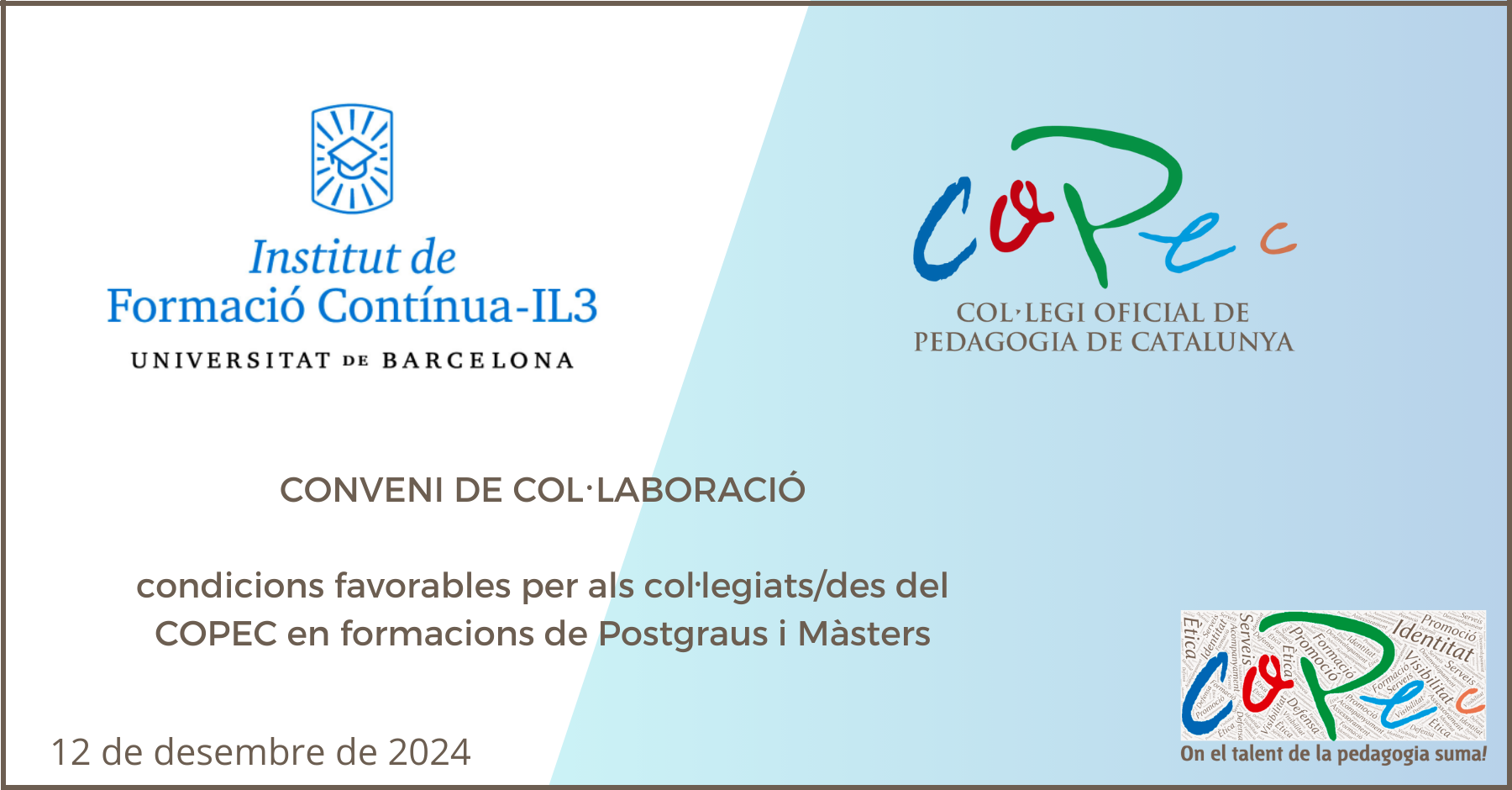 El COPEC i la Fundació Institut de Formació Contínua de la Universitat de Barcelona (IL3-UB) han signat un conveni de col·laboració amb l’objectiu d’oferir formació de qualitat als professionals de la pedagogia. Gràcies a aquest conveni, els col·legiats/des del COPEC podran accedir a diversos programes formatius.
