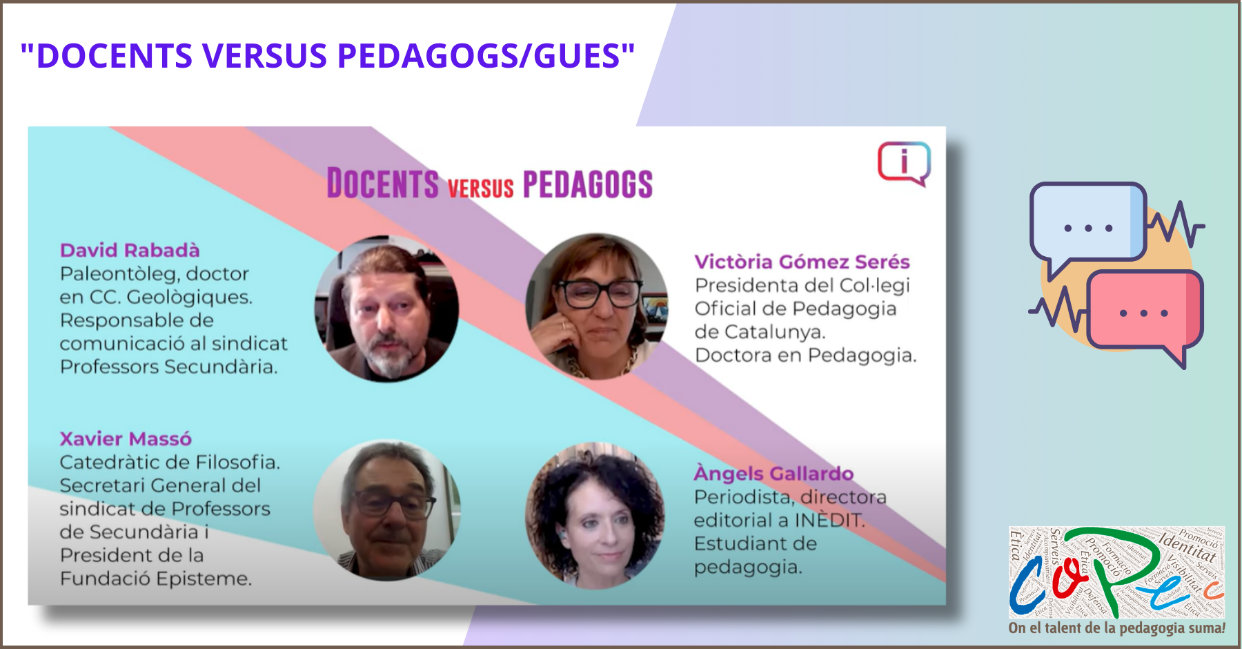 "Parlem amb docents i pedagogs/gues per diferenciar pedagogisme de la pedagogia. La relació entre docents i pedagogs/gues no sempre és ideal però ambdós col·lectius treballen junts a dins de les escoles. Ambdós col·lectius són ignorats de forma sistemàtica pels polítics i les reformes importants del sistema educatiu. L’objectiu d’aquest debat és reflexionar sobre la situació de l’educació actual, perquè tant docents com pedagogs creuen que l’educació pateix una desacreditació crònica i constant en vers l’aprenentatge i que als entorns polítics i socials sempre hi ha altres experts, allunyats de l’entorn educatiu, que parlen d’educació i practiquen el pedagogisme sense fonaments. És una oportunitat per enraonar sobre què és la pedagogia i què la pràctica docent i com es relacionen ambdues."