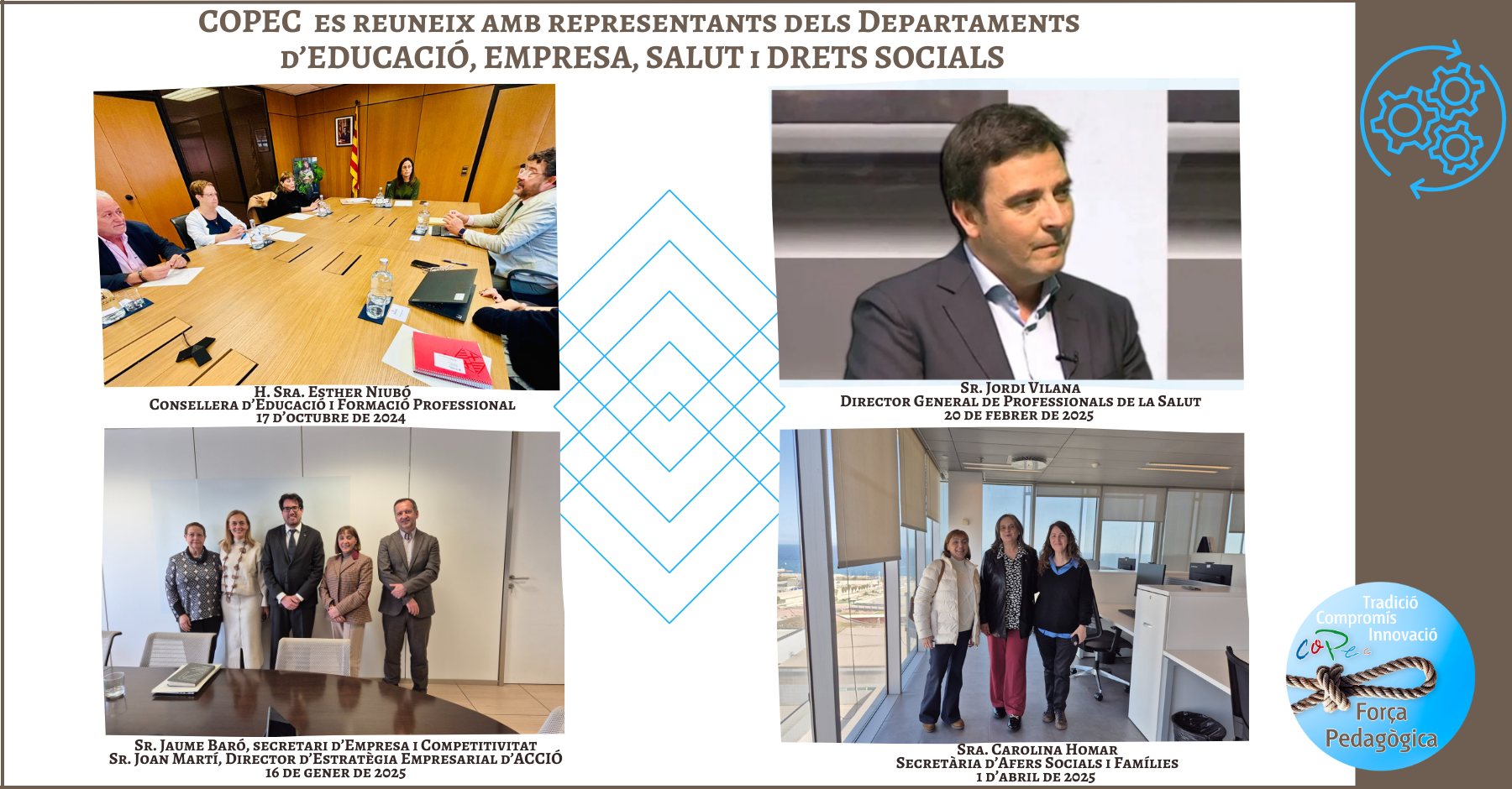 El Col·legi de Pedagogs de Catalunya (COPEC) ha dut a terme una ronda de visites institucionals a les conselleries d’Educació, Salut, Drets Socials i Empresa i Treball de la Generalitat de Catalunya amb l’objectiu de reforçar els vincles de col·laboració en els àmbits en què desenvolupa la seva activitat.