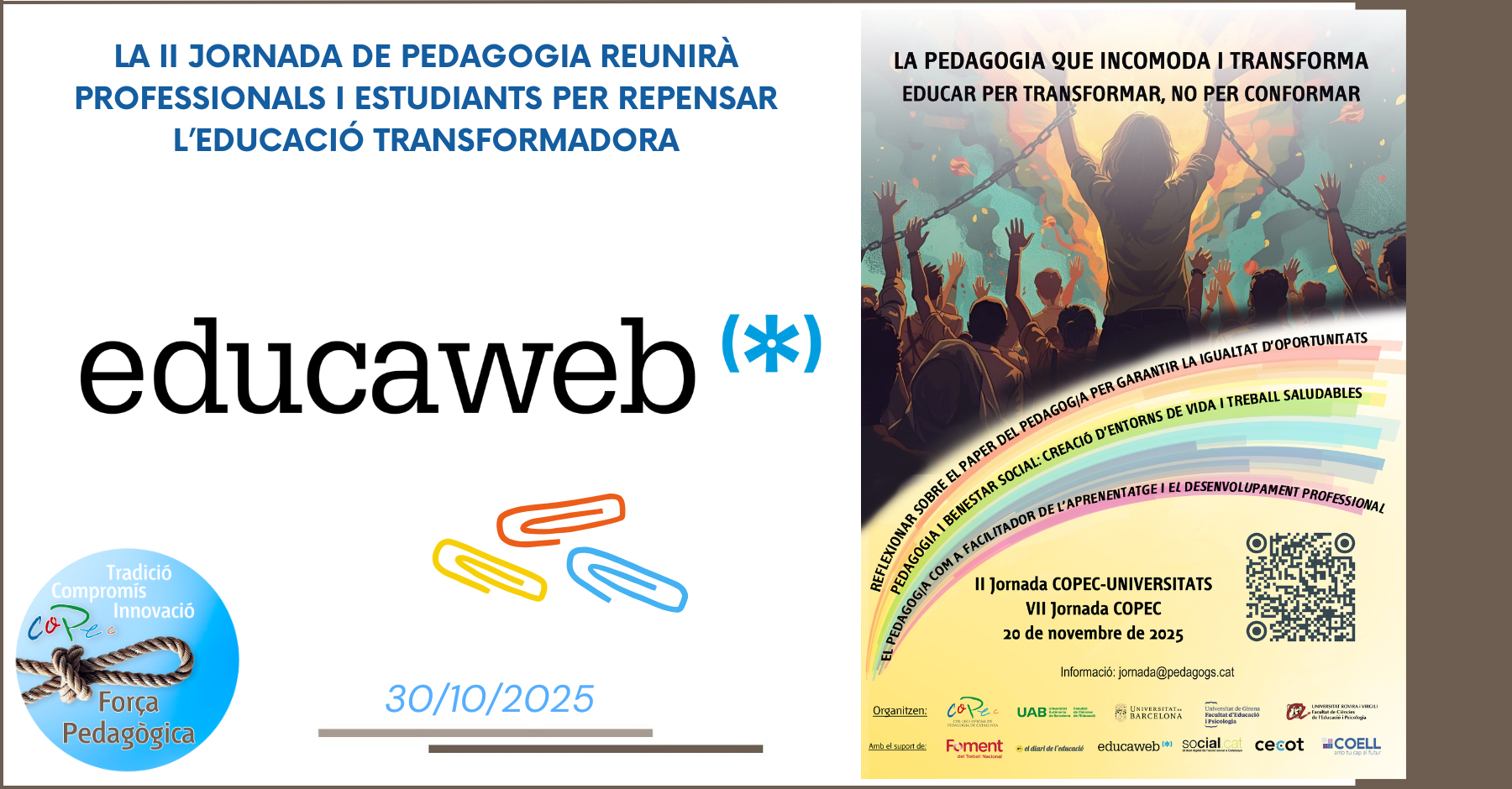 El proper 20 de novembre de 2025, el Campus de Bellaterra de la UAB acollirà la II Jornada de Pedagogia, coorganitzada pel Col·legi Oficial de Pedagogia de Catalunya (COPEC), la Universitat de Barcelona (UB), la Universitat Autònoma de Barcelona (UAB), la Universitat de Girona (UdG) i la Universitat Rovira i Virgili (URV).