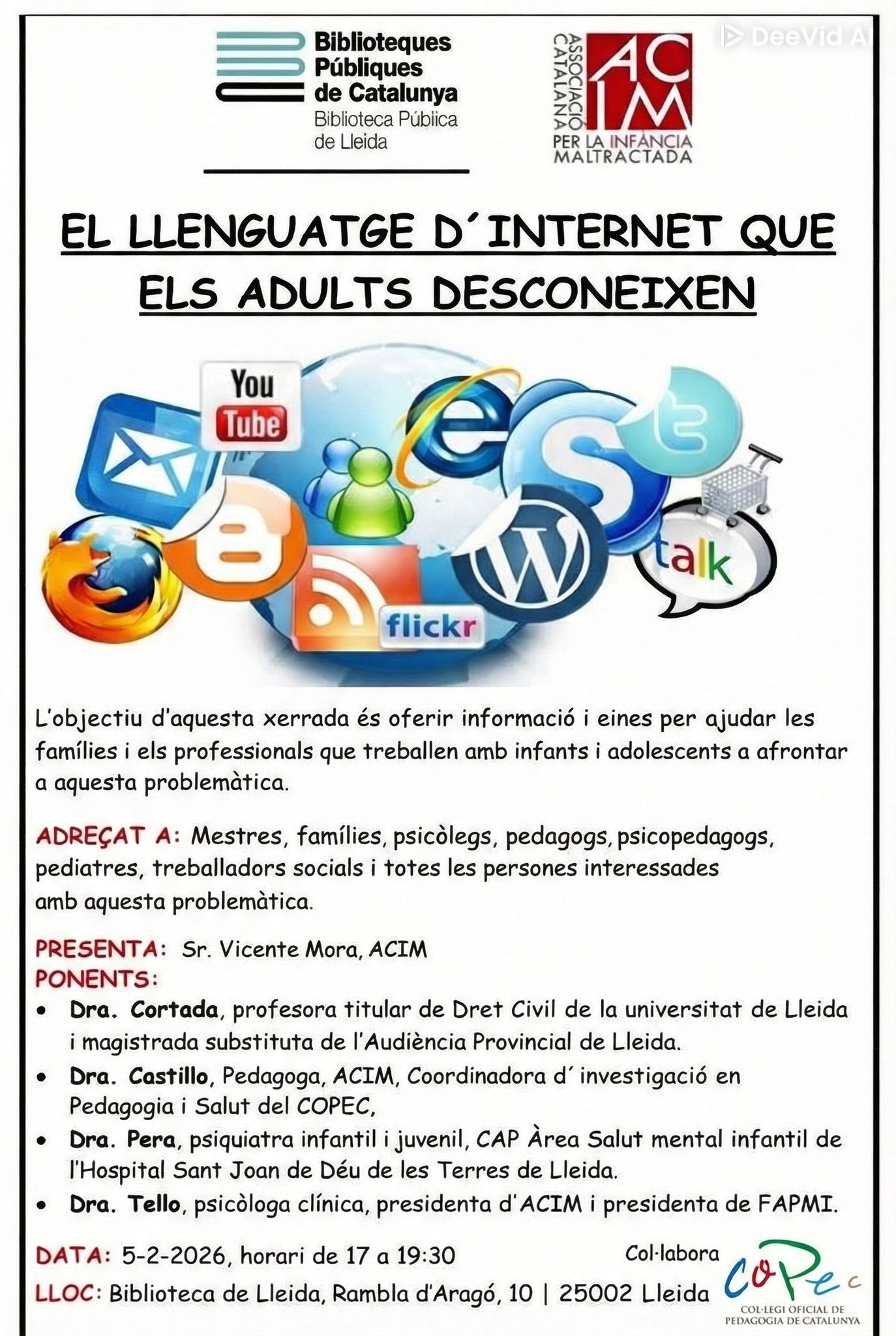 L’objectiu de la xerrada és oferir informació i recursos pràctics que ajudin famílies, docents i professionals a comprendre millor l’entorn digital en què creixen els infants i adolescents, i a afrontar-ne els reptes des d’una mirada preventiva i educativa.