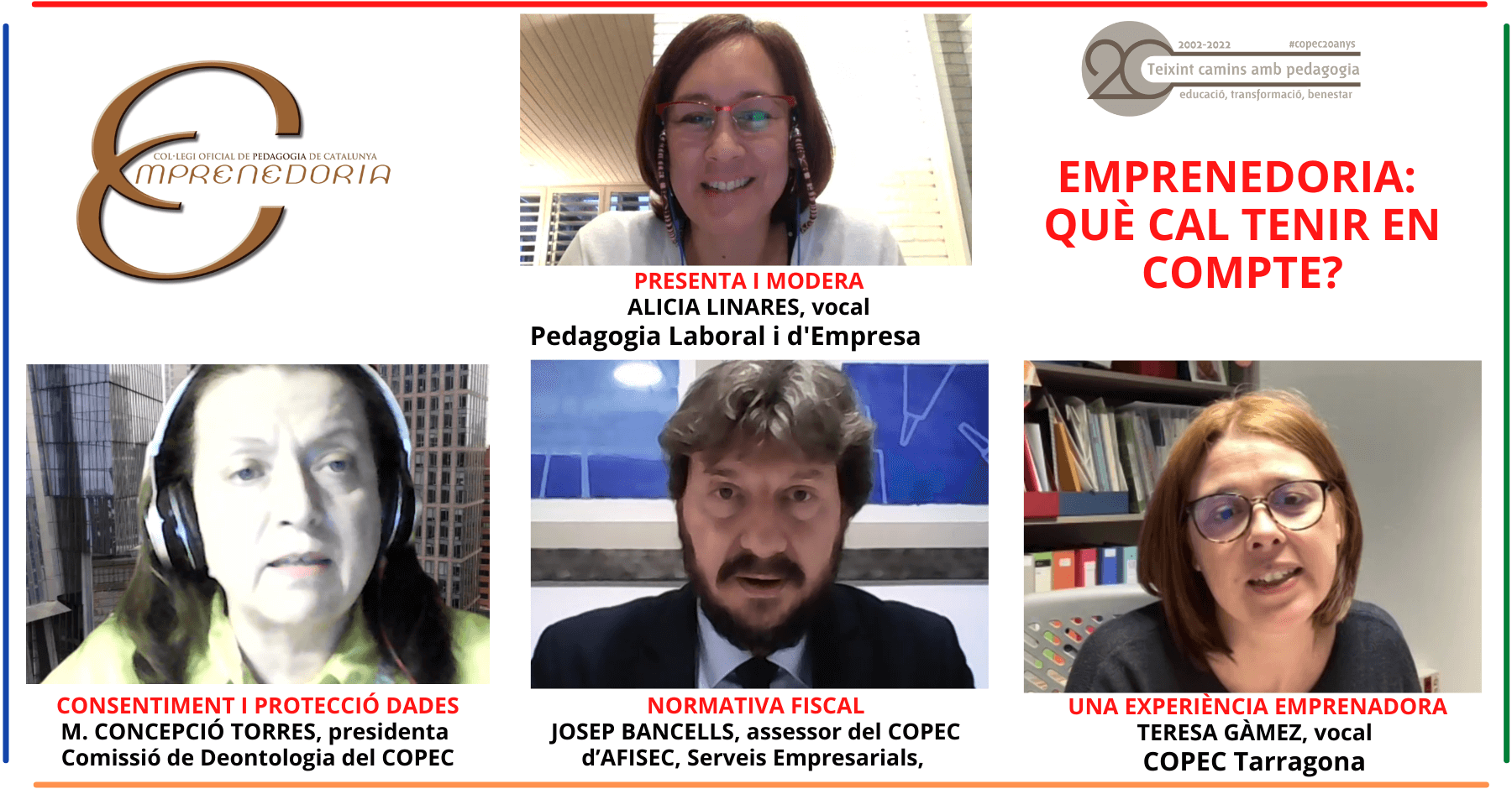 Ayer 21 de enero y siguiendo con las actividades del COPEC, tuvo lugar el seminario virtual Emprendimiento: Que hay que tener en cuenta? Un acto abierto a pedagogos/gues y psicopedagogos/gues interesados en adentrarse en la aventura de emprender un proyecto por cuenta propia. Durante la sesión se abordaron temas y dudas que nos encontramos los profesionales que trabajan por cuenta propia.