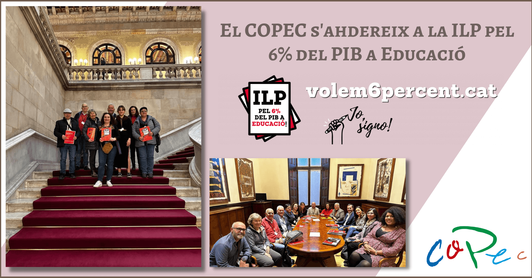 Para hacer posible el 6% del PIB por la educación se necesita disponer de un mínimo de 50.000 firmas de personas mayores de 16 años y censadas en Catalunya. Te animamos a participar firmando la ILP en nuestra sede de COPEC Barcelona (Avinguda Mistral, 20, Bis, entresòl 2ª)